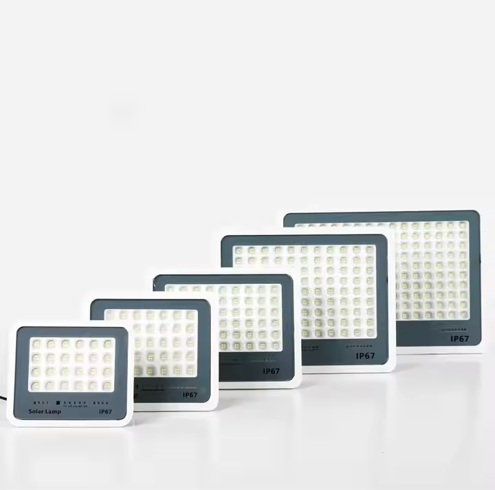 Solar flood lighting with lithium ferro phosphate battery built in the luminaire, separate solar panel, with remote controller and installation accessories.